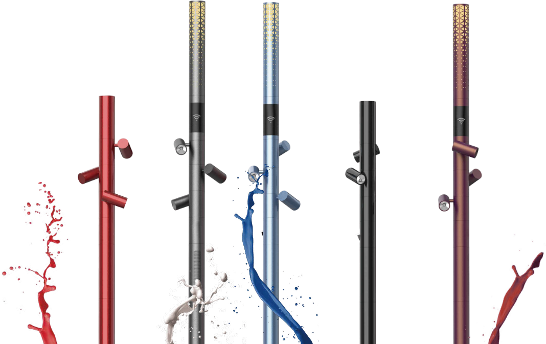 Smart lamp poles redefine urban aesthetics with customizable colors as a CITY ELEMENT. Whether in white, red, green, grey, blue, or black, each hue adds character. Adaptable to occasions and seasons, intensifying the emotional experience of urban spaces, the color becomes a statement, reflecting the city's identity